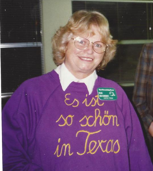 Helga’s interest in people and history included volunteering in many venues. She was very active with the German-Texan Heritage Society (GTHS), where her knowledge of all things German could be useful, especially since Helga can decipher the old German script used in many immigrants’ documents and letters. Helga became a member of GTHS in 1980 and she was director on the board for many years and President of the German Free School Guild for two years. Helga also established the Thursday lunch time “Stammtisch” at the German Free School, which is still being held. On 7 May 2009 Helga was presented with the “Federal Republic of Germany Friendship Award” for her many years of volunteer involvement in promoting friendly relationships between Germans and Americans. Helga was also active with the Austin-Koblenz Sister City Alliance.