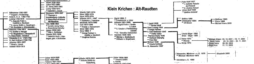 In December 2009, Hans had the family tree scanned in. If you look on the bottom right section you can see the “Alt Raudten” branch of the family. The compendium contains six variations of the tree. It also discusses the potential beginning of the Schweinitz family tree.