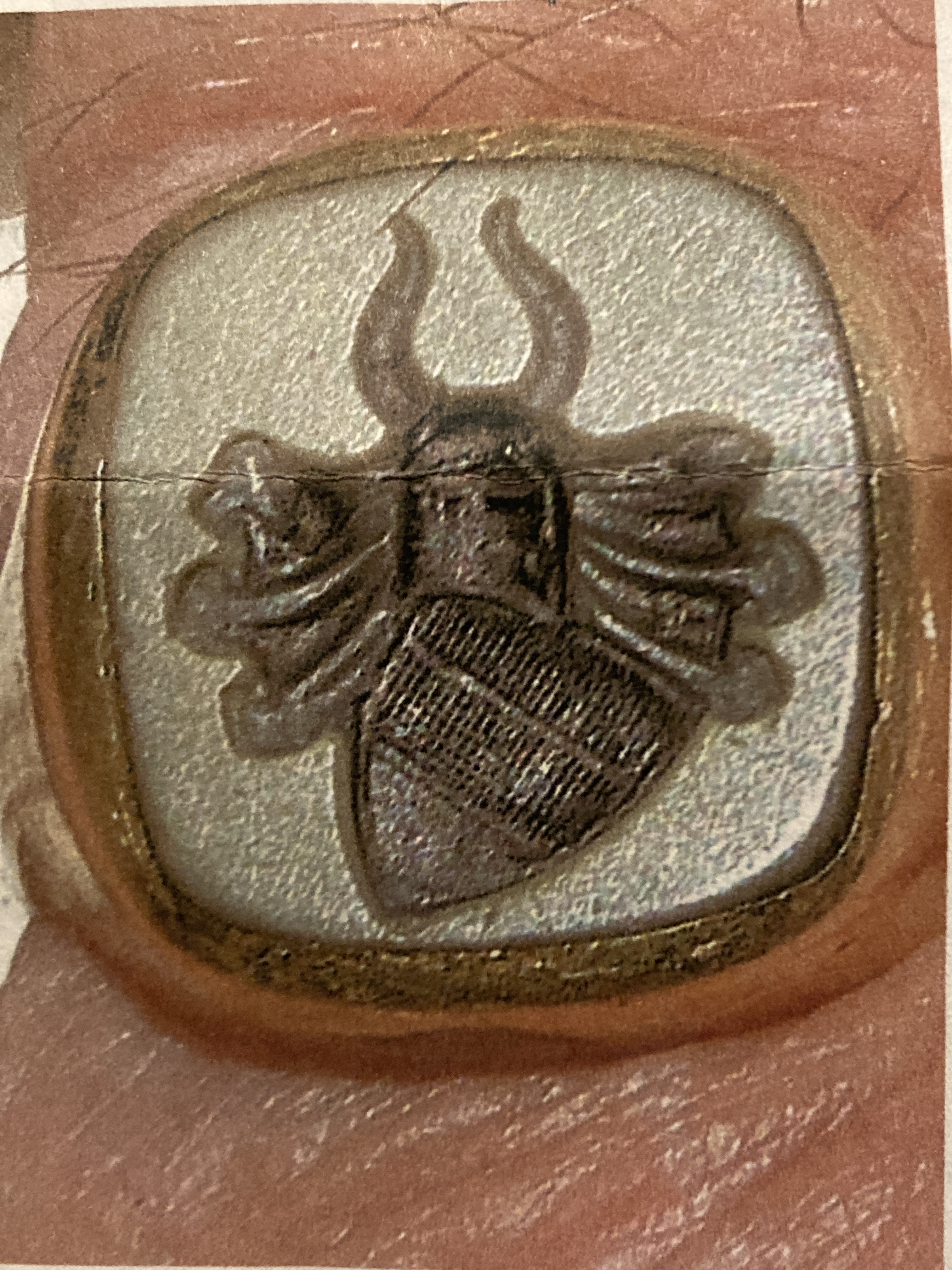The crest above is based on a photograph of the crest on the inside lid of a golden watch found by Hans and Helga. This design was used on Hans’ signature ring.